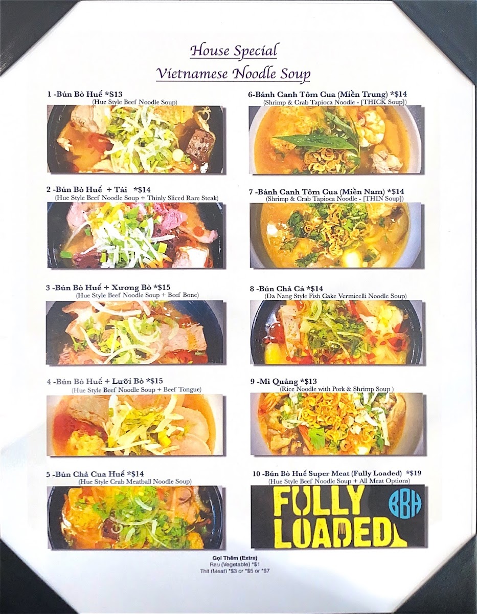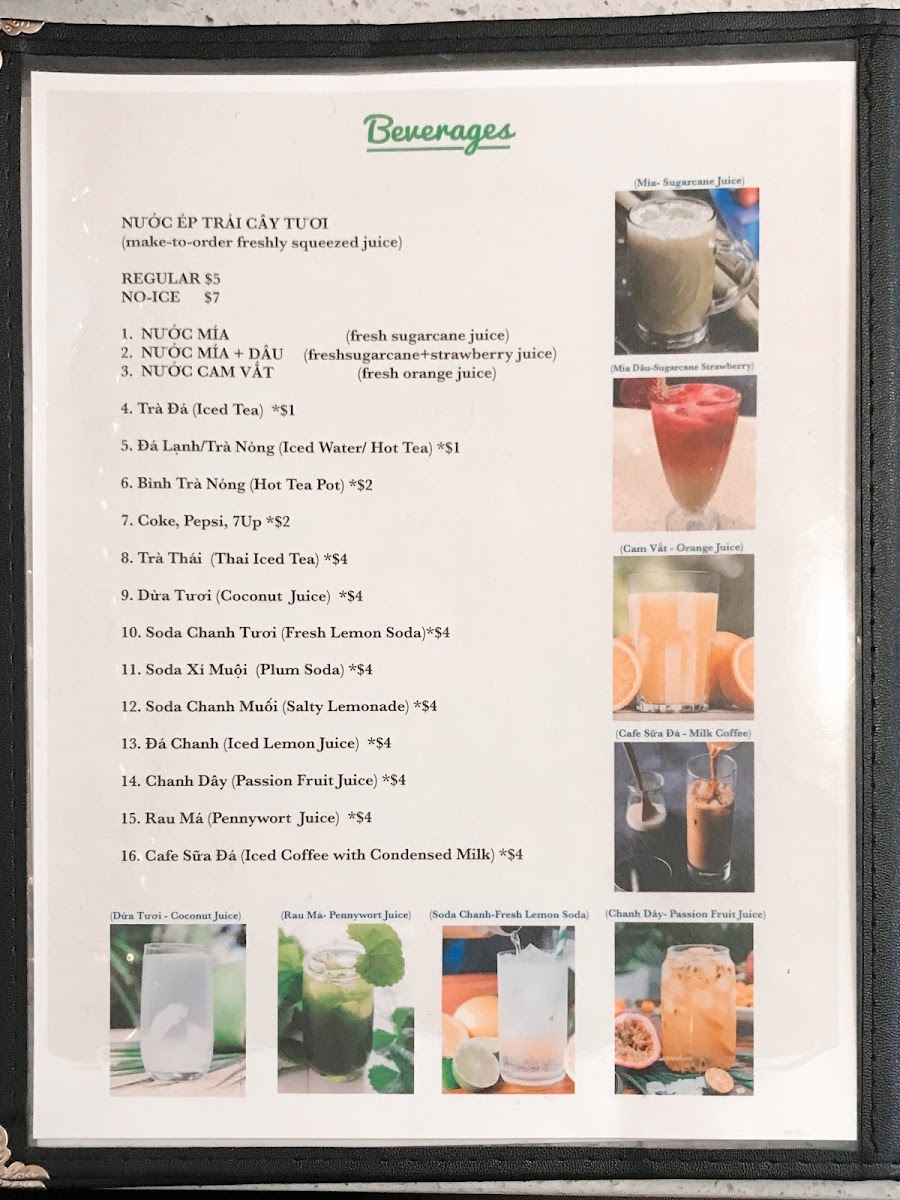 Overall, the menu provides a balanced range of food and drink choices suitable for those seeking traditional Vietnamese fare in a straightforward and accessible format.