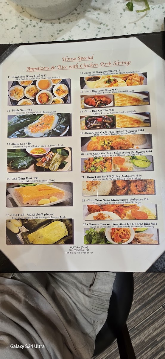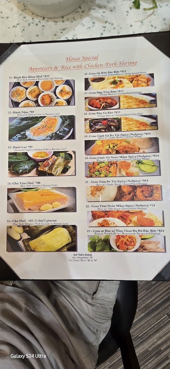 The menu at Hue Kitchen features a variety of traditional Vietnamese dishes with a focus on specialties from the Central Vietnam region. The offerings include noodle soups such as Bun Bo Hue with different protein options, rice dishes like Cơm Gà Roti Đặc Biệt, and steamed items including Steam Shrimp Cake in Banana Leaf and Bánh Bèo Khay Huế. Beverages include refreshing options such as Sugarcane Strawberry Juice and Iced Tea.